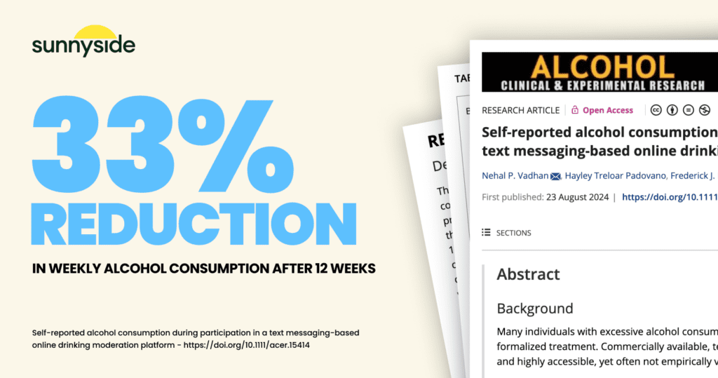A new study proves that Sunnyside’s use of adaptive text messages to help people with alcohol moderation leads to a 33% reduction in weekly drinks after 12 weeks.